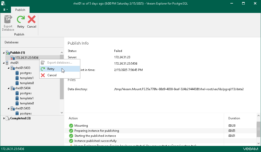 If anything disrupts the publishing process (the target or mount server crashes or the network is down), the restore process stays in the waiting mode and performs 10 automatic retries every 5 minutes. If the retries fail, you can launch the retry manually after the server or network is up.