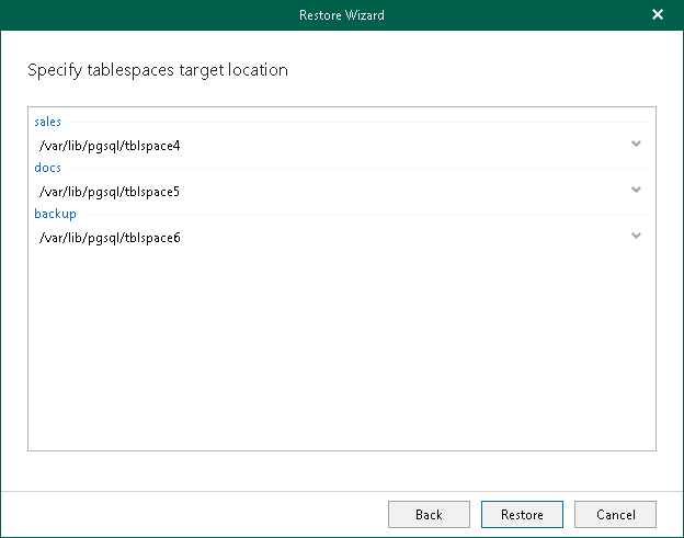This is an archive version of the document. To get the most up-to-date information, see the current version. Step 5. Specify Tablespaces At this step of the wizard, specify paths of directories where database tables will be stored.NoteIf any of the target tablespace directories are not empty, you will be prompted to overwrite them before proceeding to the next step.