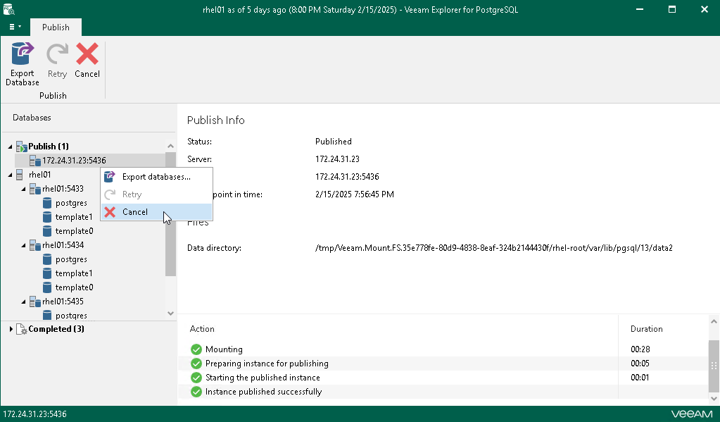 - Upon closing the Veeam Explorer for PostgreSQL console, all published instances will be detached from target servers automatically. Mount points will be also dismounted from under the /tmp directory.