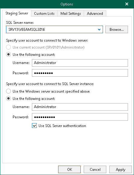 - Use current account. To connect to the specified server using the current user account under which Veeam Explorer for Microsoft SharePoint running.