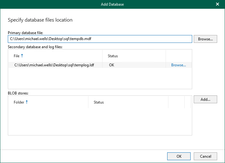 - Specify the location of a primary database file, a secondary database file and associated log files. If necessary, specify the BLOB store location.