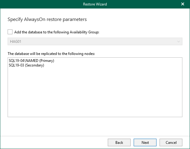 If the specified target Microsoft SQL Server supports AlwaysOn Availability Groups, you will be offered to specify AlwaysOn restore options. To use the AlwaysOn capabilities for the restored database, do the following: