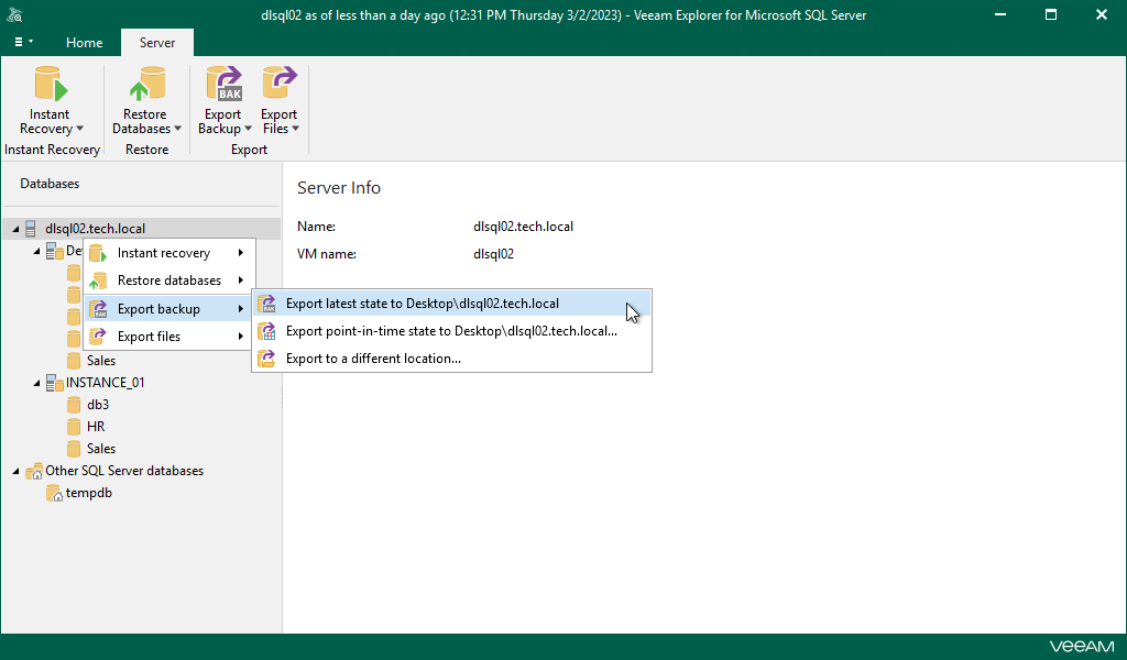 Alternatively, you can right-click an instance or the server and select Export backup > Export latest state to Desktop\<server_name>.