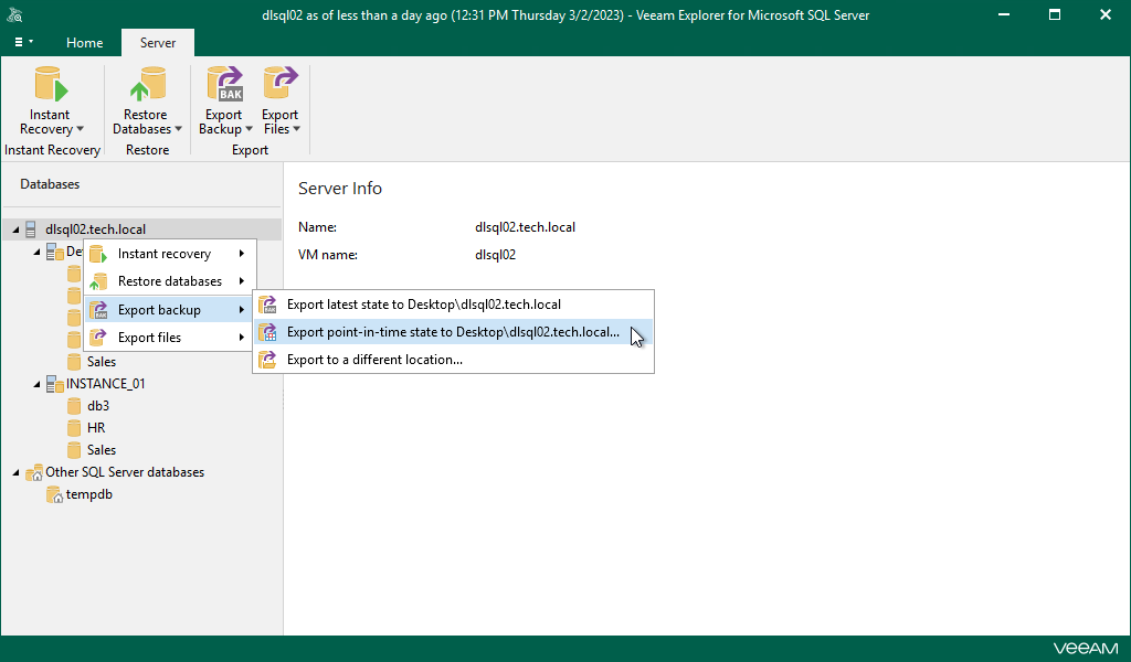 Alternatively, you can right-click an instance or the server and select Export backup > Export point-in-time state to Desktop\<server_name>.