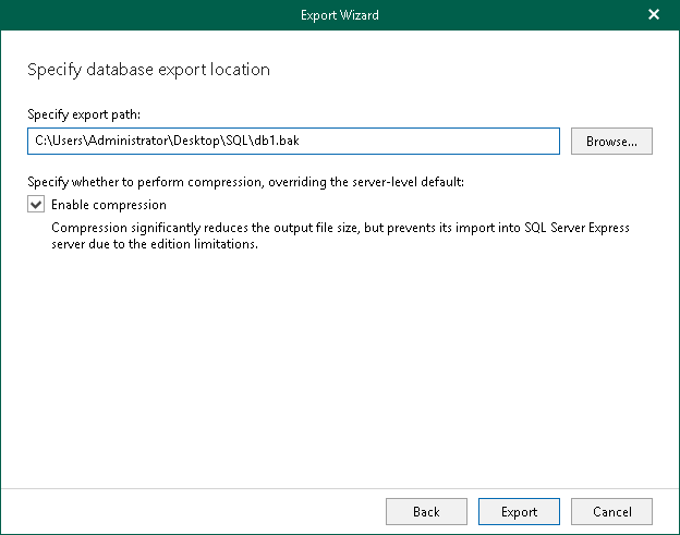 This is an archive version of the document. To get the most up-to-date information, see the current version. Step 4. Specify Export Location At this step of the wizard, specify the path to the destination directory and click Export.You can select Enable compression check box to reduce the output file size.NoteCompression is unavailable if the staging SQL server runs any Express Edition of Microsoft SQL Server.