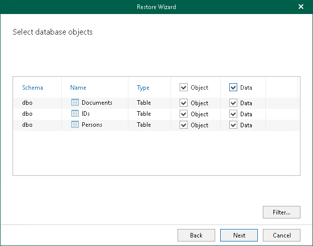 Use the Object and Data check boxes to specify what database objects and data should be restored.