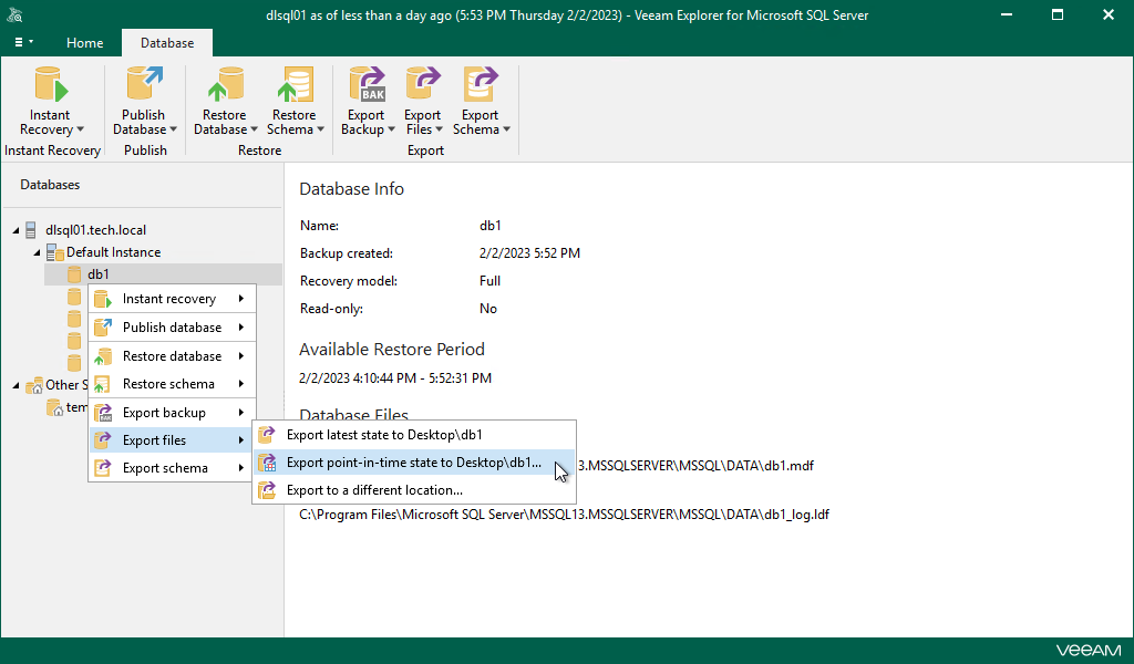 Alternatively, you can right-click a database and select Export files > Export point-in-time state to Desktop\<db_name>.