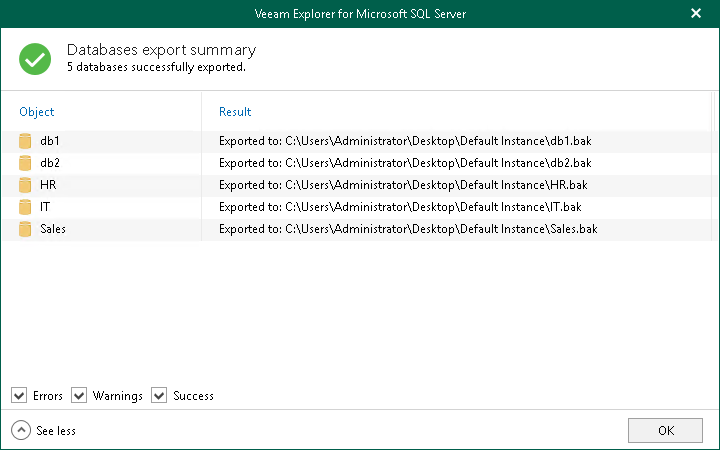 At the Databases export summary step, click See more to expand the window and review details of the export operation.