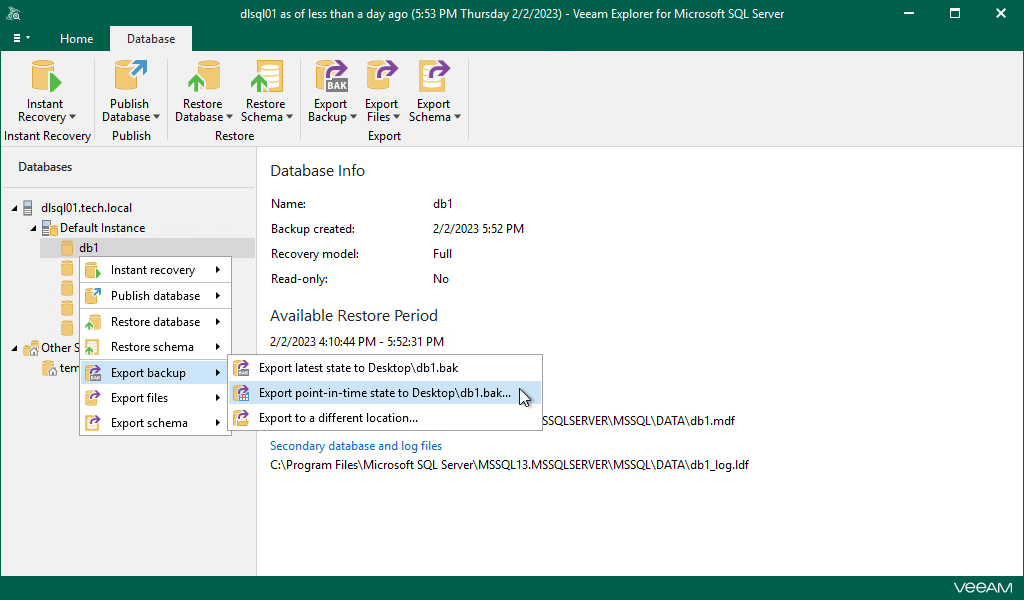 - On the Database tab, select Export Backup > Export point-in-time state to Desktop\<db_name>.bak.