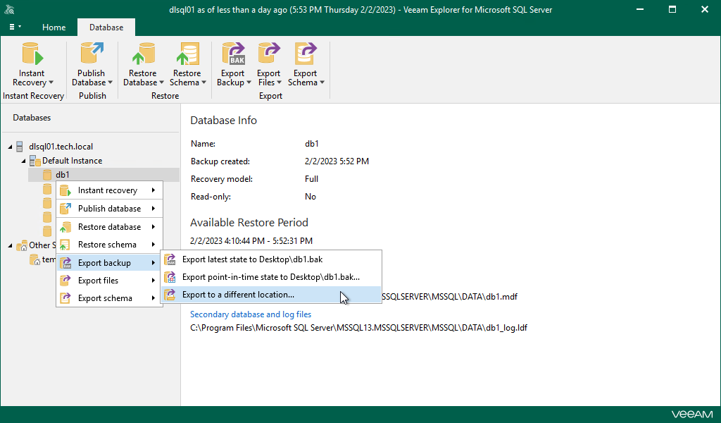 This is an archive version of the document. To get the most up-to-date information, see the current version. Step 1. Launch Export Wizard To launch the Export wizard, do the following:In the navigation pane, select a database.On the Database tab, select Export Backup > Export to a different location.Alternatively, you can right-click a database and select Export backup > Export to a different location.