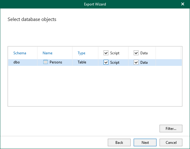 This is an archive version of the document. To get the most up-to-date information, see the current version. Step 4. Select Database Objects At this step of the wizard, select database objects to restore.To display only specific objects, click Filter and select an object type you want to be shown in the list.