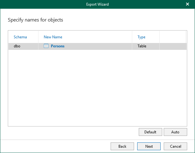This is an archive version of the document. To get the most up-to-date information, see the current version. Step 5. Specify Names for Objects At this step of the wizard, specify the name to be assigned to the object.To specify a new name, select a database and provide a new name.To assign a default name with the _new suffix, click Auto.