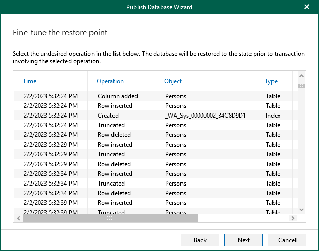 At this step of the wizard, select an operation prior to which you want to publish your database.