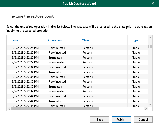 At this step of the wizard, select an operation prior to which you want to publish your database and click Publish.