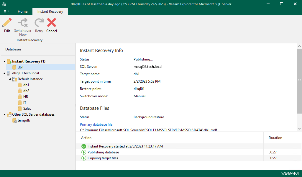 After you finish steps of the Instant Recovery wizard, Veeam Explorer for Microsoft SQL Server starts an instant recovery session.