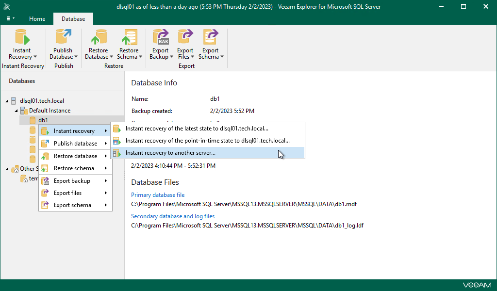 Alternatively, you can right-click a database and select Instant recovery > Instant recovery to another server.