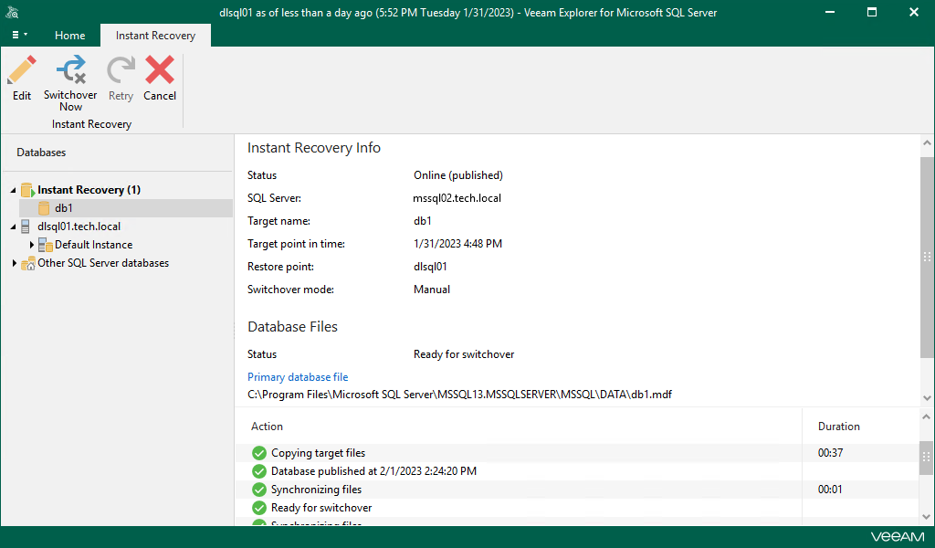 After you finish steps of the Instant Recovery wizard, Veeam Explorer for Microsoft SQL Server starts an instant recovery session which shows the progress of the recovery process.
