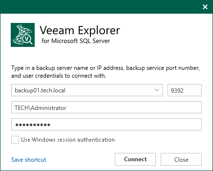 To use the account under which Veeam Explorer for Microsoft SQL Server is running, select Use Windows session authentication.