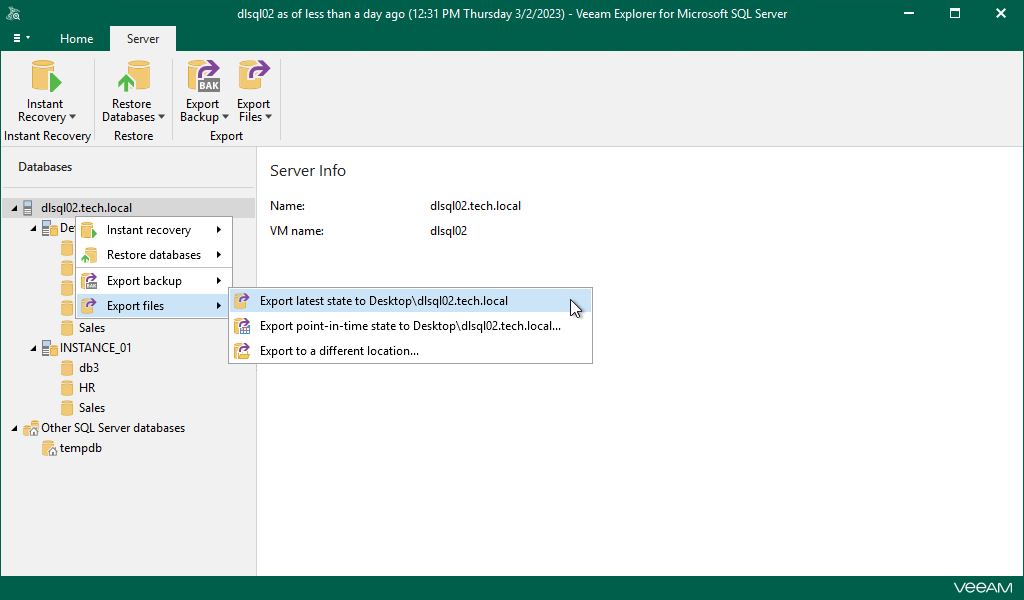 - On the Instance or Server tab, select Export Files > Export latest state to Desktop\<server_name>.