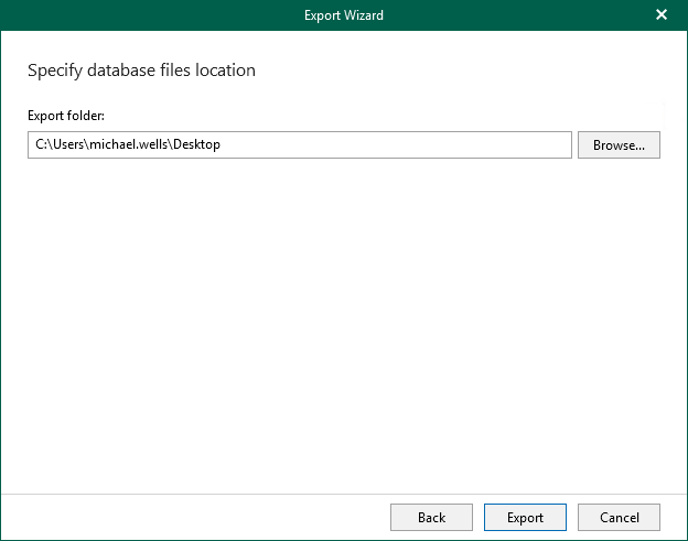 This is an archive version of the document. To get the most up-to-date information, see the current version. Step 4. Specify Export Location At this step of the wizard, specify a path to the directory where you want to export database files and click Export.Click Browse to specify the path manually.