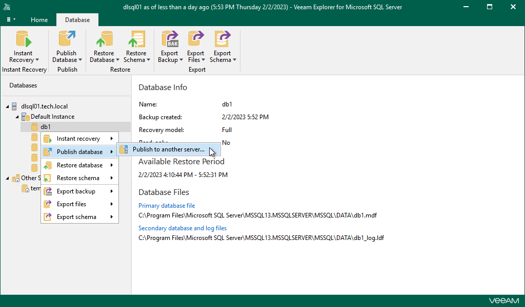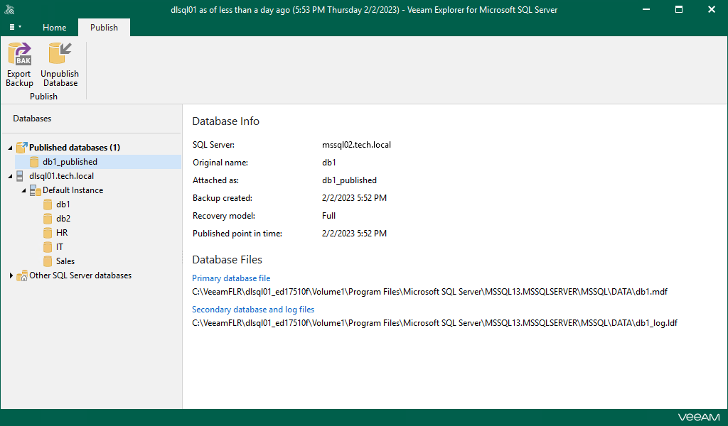 The figure below demonstrates a published database (db1_published) available in the Object Explorer window of your Microsoft SQL Server Management Studio console. This database is also being referenced by Veeam Explorer for Microsoft SQL Server under its Published databases node.