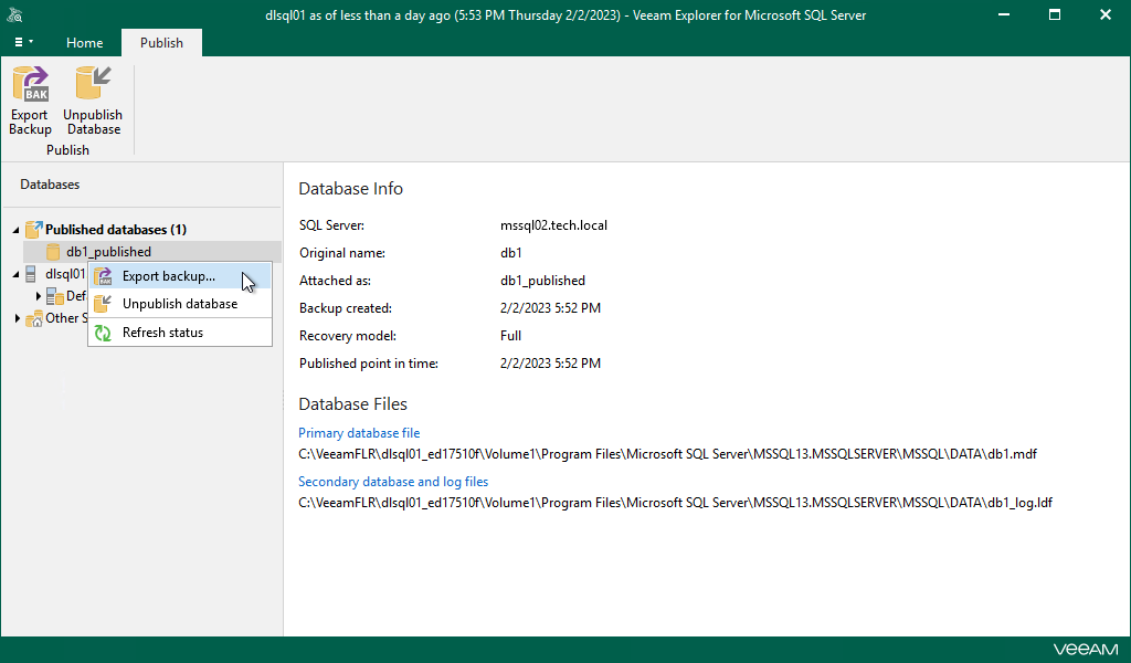 - On the Publish tab, select Export backup or you can right-click a database and select Export backup.