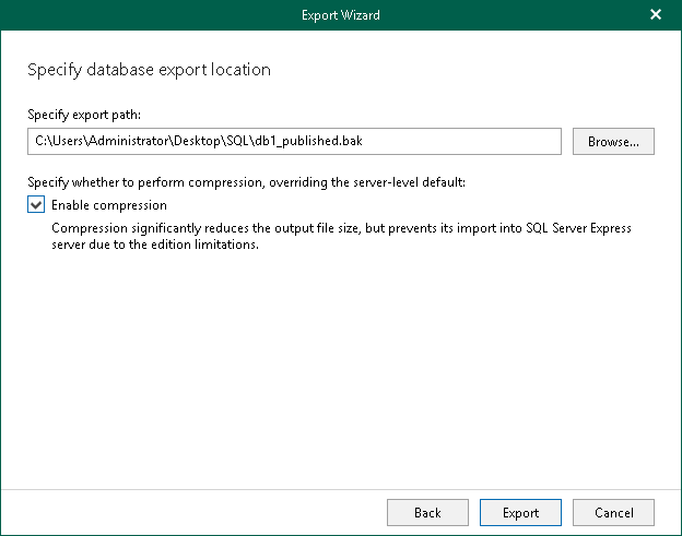 - Select the Enable compression check box to compress the exported database. Compression will be applied according to configuration of the SQL server to which the database is published.