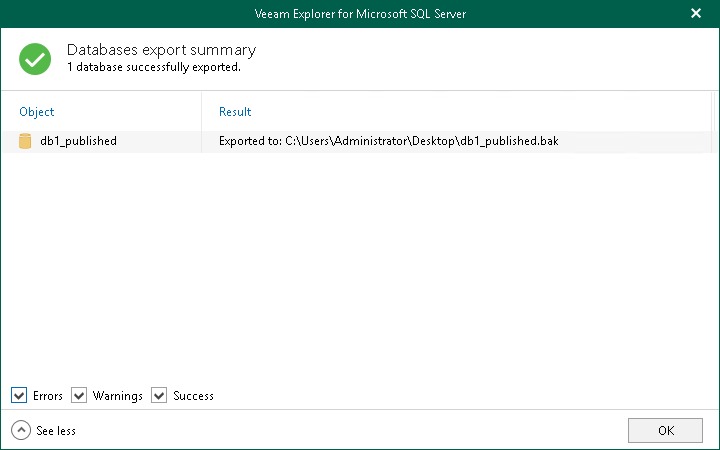 - After the export process is complete, review the results shown in the Databases export summary window. To do this, click See more to expand the window and review details of the export operation.