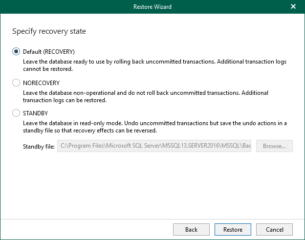This allows further restore stages to carry on from the restore point. When applying this option, the database will be in a norecovery state and inaccessible to users.