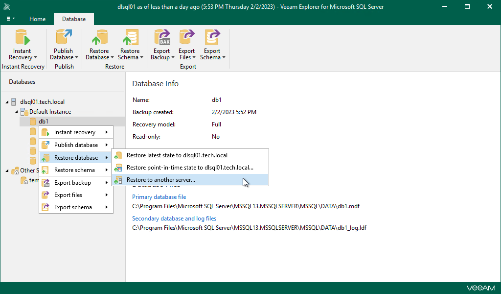 This is an archive version of the document. To get the most up-to-date information, see the current version. Step 1. Launch Restore Wizard To launch the Restore wizard, do the following:In the navigation pane, select a database.On the Database tab, select Restore Database > Restore to another server.Alternatively, you can right-click a database and select Restore database > Restore to another server.