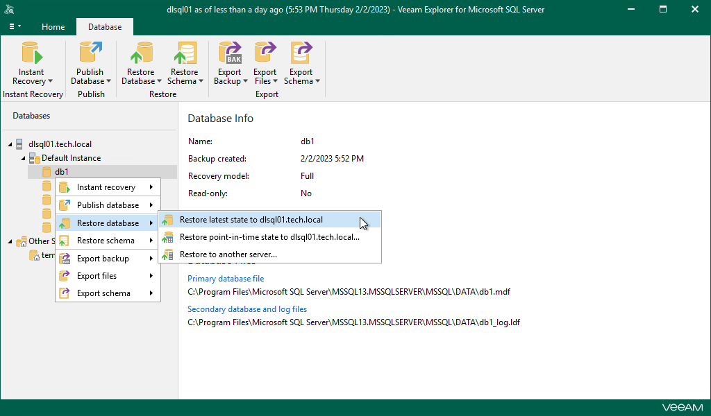 - On the Database tab, select Restore Database > Restore latest state to <original_location>.
