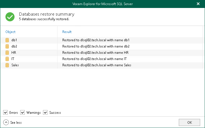 This is an archive version of the document. To get the most up-to-date information, see the current version. Step 3. Review Restore Summary At the Databases restore summary step, click See more to expand the window and review details of the restore operation.You can filter notifications by their status: Error, Warning or Success.