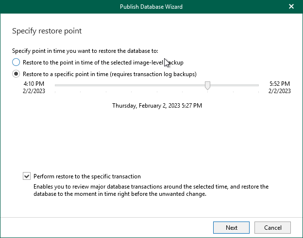 - Select the Restore to the point in time of the selected image-level backup option to load database files as of the moment when the current restore point was created.