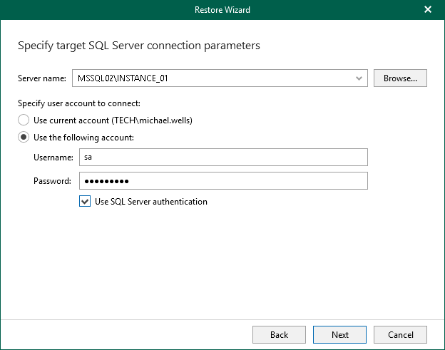 - Use current account. Select this option to connect to the specified server using the account under which Veeam Explorer for Microsoft SQL Server is running.
