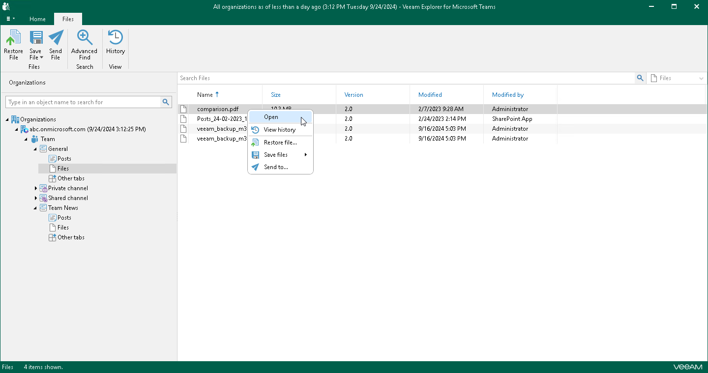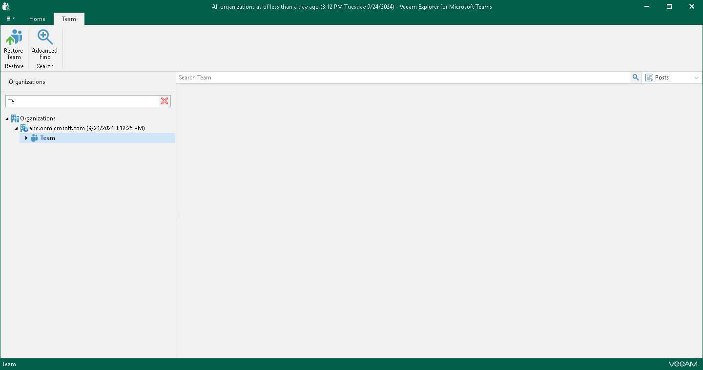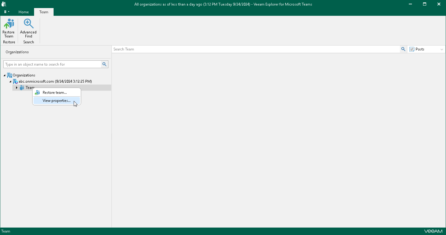 You can use Veeam Explorer for Microsoft Teams to view the contents of a backup file, view team properties, open posts and files, search for teams and for items in a backup file as well as customize criteria of your search.