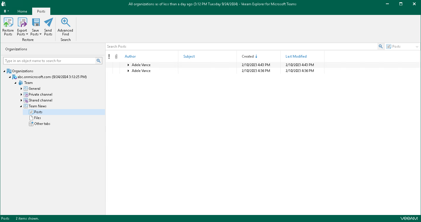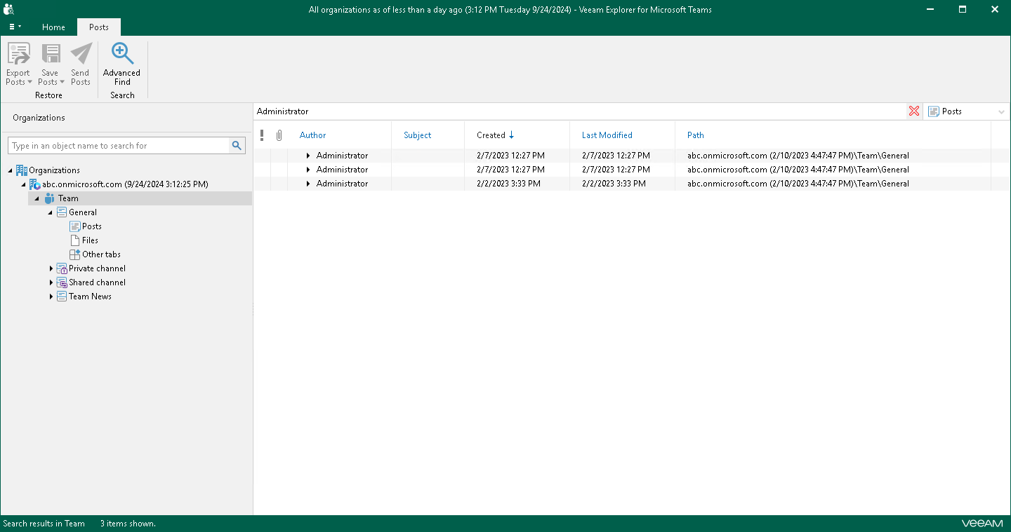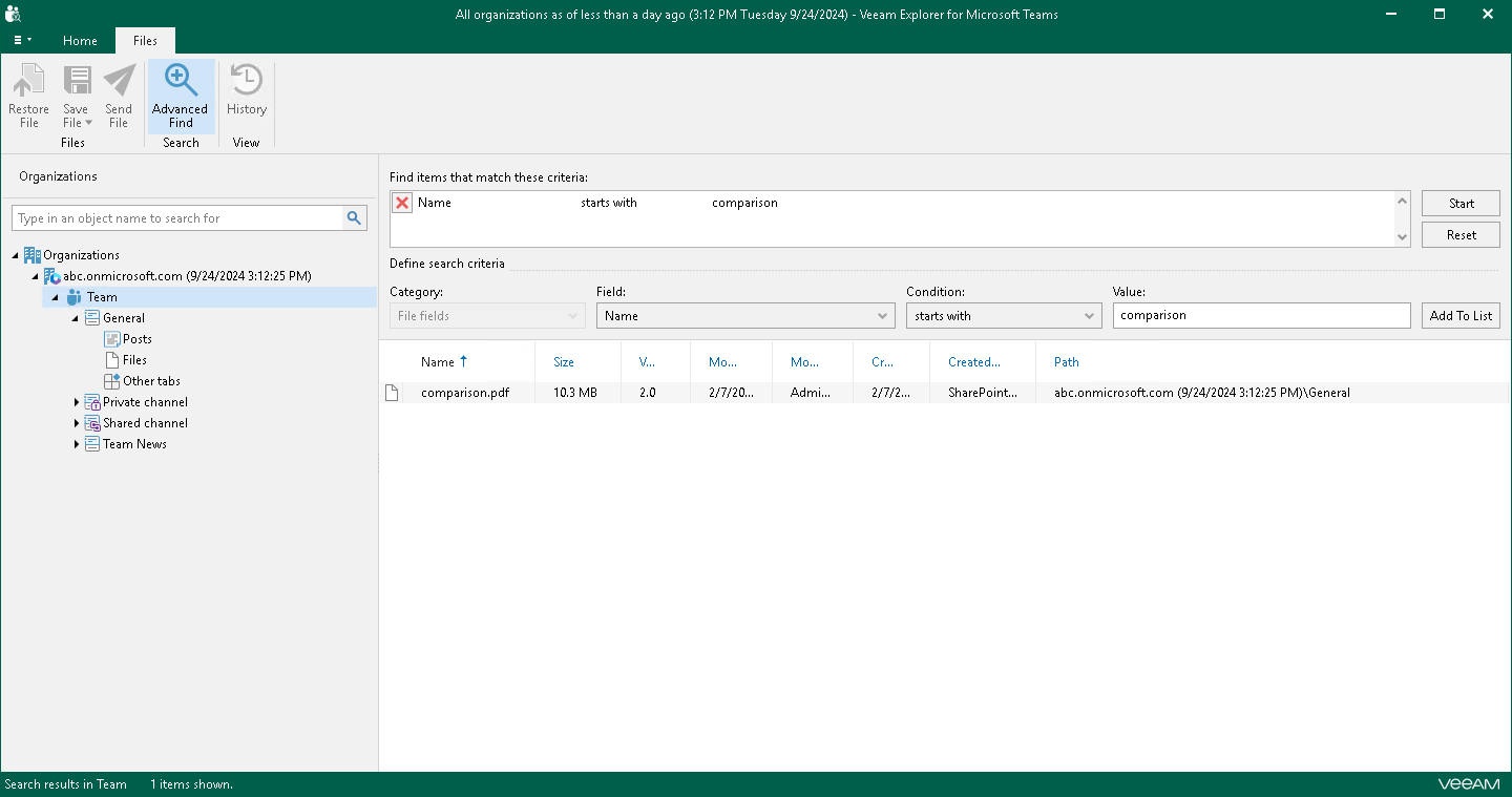 You can use Veeam Explorer for Microsoft Teams to view the contents of a backup file, view team properties, open posts and files, search for teams and for items in a backup file as well as customize criteria of your search.