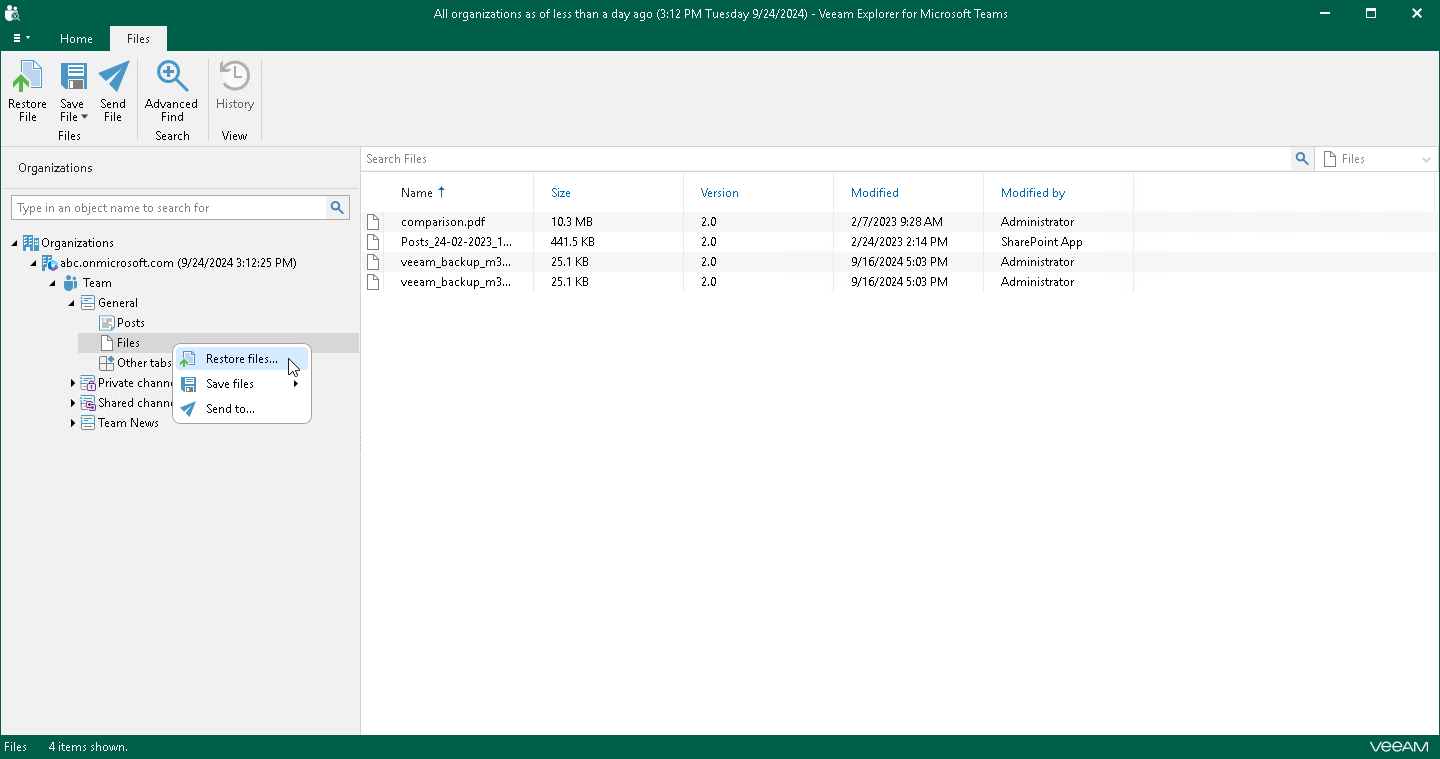- In the navigation pane, expand a channel whose files you want to restore, right-click Files and select Restore files.
