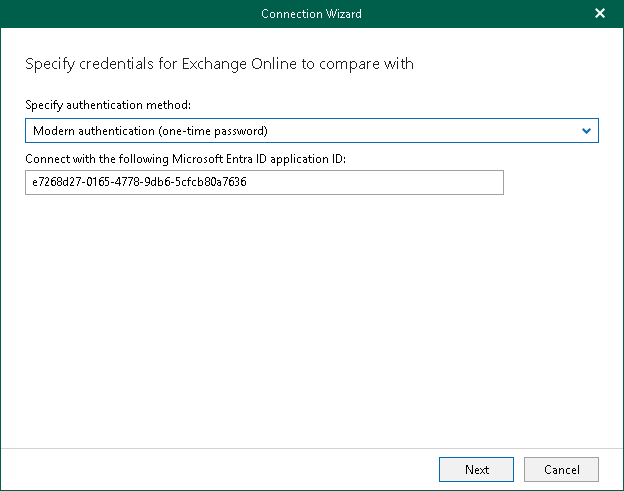 By default, Veeam Explorer for Microsoft Exchange populates this field with the identification number of the application that was used during a backup session. If you want to use another application, make sure to grant this application required permissions. For more information, see the Microsoft Entra Application Permissions section of the Veeam Backup for Microsoft 365 User Guide.