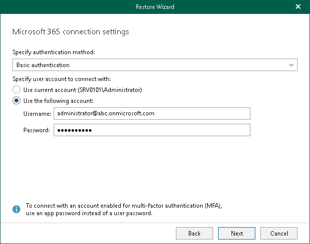 Modern authentication allows Veeam Backup for Microsoft 365 to use a Microsoft Entra application for data restore. Such an application is used to restore the specified mailbox, folder or item back to Microsoft 365 organizations with enabled multi-factor authentication (MFA). For more information, see the Adding Microsoft 365 Organizations section of the Veeam Backup for Microsoft 365 User Guide.