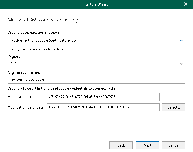 By default, Veeam Explorer for Microsoft Exchange populates this field with the identification number of the application that was used during a backup session. If you want to use another application, make sure to grant this application required permissions. For more information, see the Microsoft Entra Application Permissions section of the Veeam Backup for Microsoft 365 User Guide.