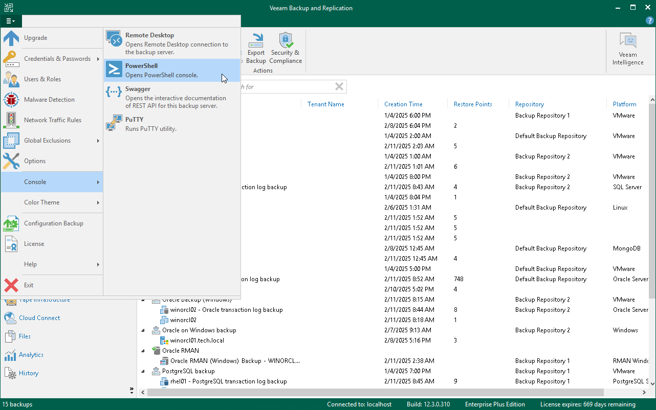 - In the main menu of Veeam Backup & Replication, select Console > PowerShell.