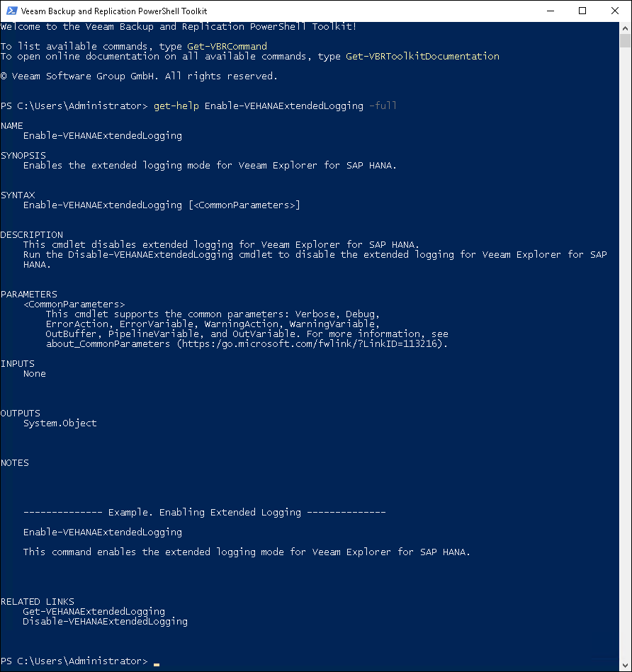 The Get-Help cmdlet is a Microsoft cmdlet. You can use this cmdlet to get information on Microsoft cmdlets, as well as on cmdlets added with Veeam Explorers PowerShell modules.
