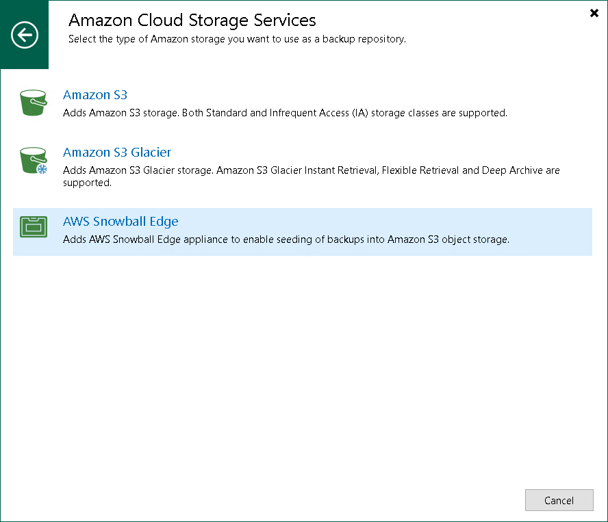 - In the Add Backup Repository window, select Object storage > Hyperscalers > Amazon S3 > AWS Snowball Edge.
