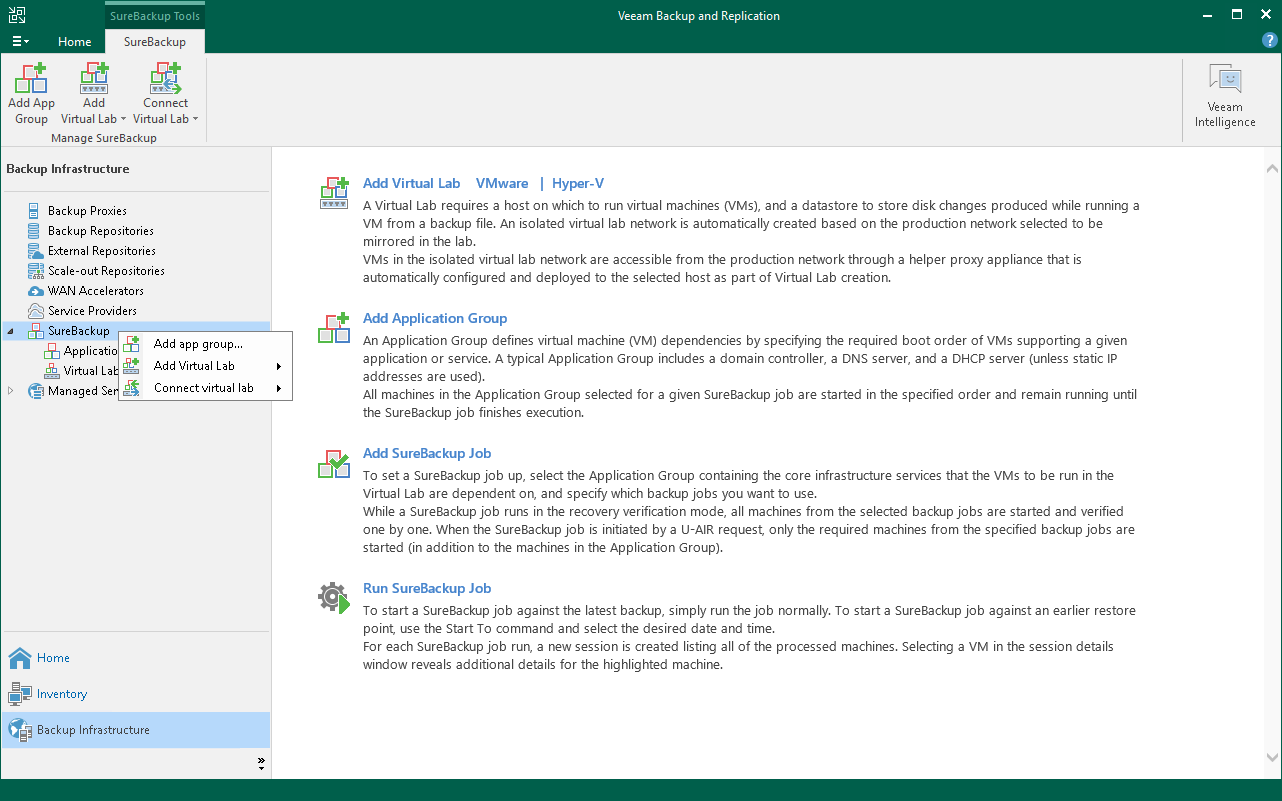 - Open the Backup Infrastructure view, in the inventory pane right-click Application Groups under SureBackup and select Add App Group.