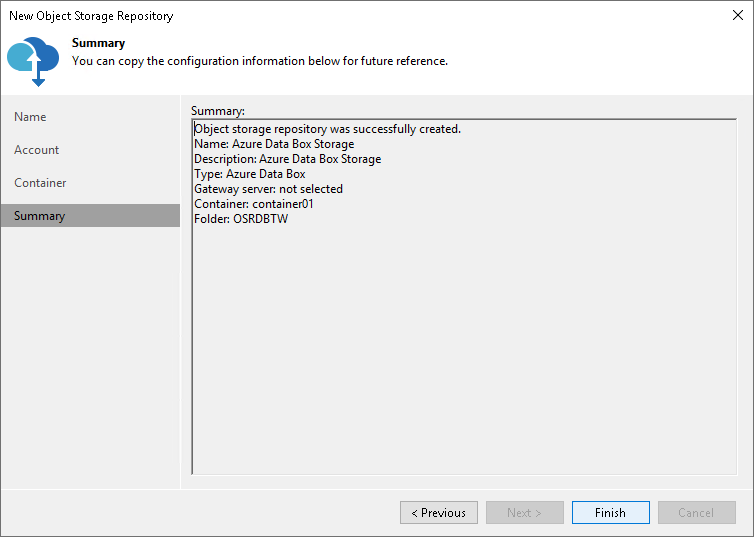 At the Summary step of the wizard, review details of the newly created object storage repository and click Finish.