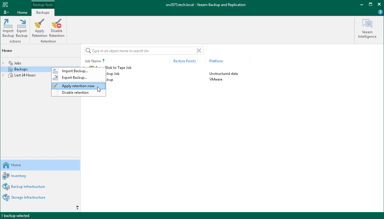Veeam Backup & Replication launches background retention every 24 hours at 00:30. If you need to free up disk space from outdated backups earlier, you can launch the background retention manually.