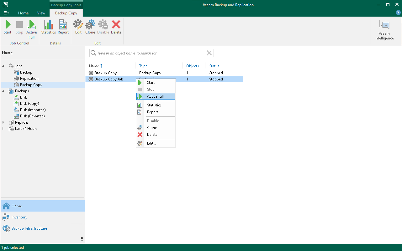 - In the working area, select the backup copy job and click Active full on the ribbon or right-click the backup copy job and select Active full. Veeam Backup & Replication will start a new backup copy session, copy data from the source backup repository and save it in a full backup file in the target backup repository.