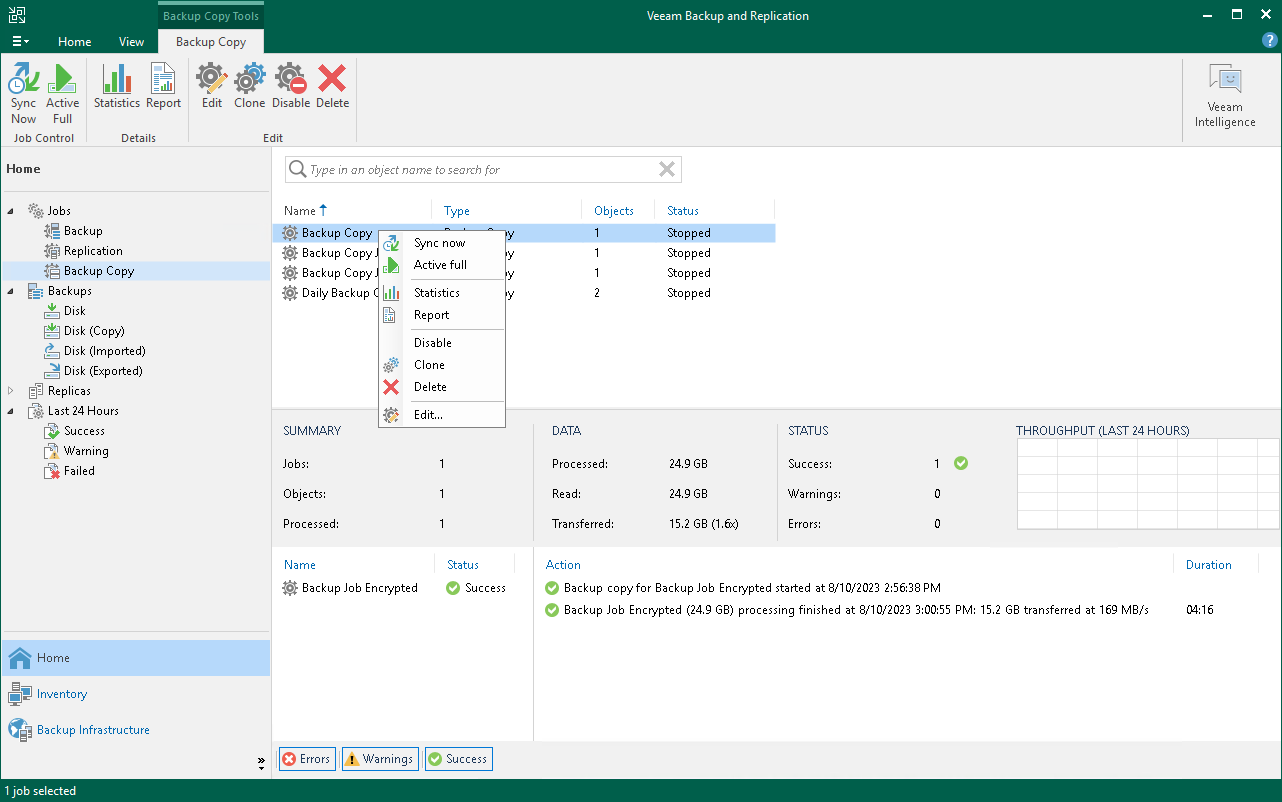You can temporarily disable backup copy jobs. The disabled job is paused for some period of time and is not run by the specified schedule. You can enable a disabled job at any time. You can also permanently delete a job from Veeam Backup & Replication and from the configuration database.