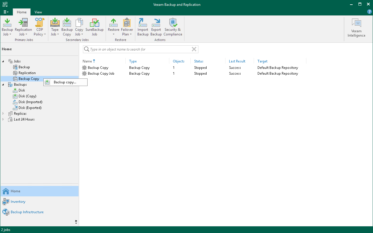- Open the Home view, in the inventory pane right-click Jobs or right-click anywhere in the working area, and click Backup Copy.