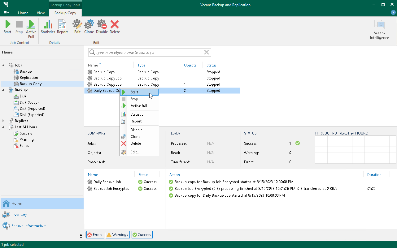 - In the working area, select the backup copy job and click Start on the ribbon or right-click the backup copy job and select Start.